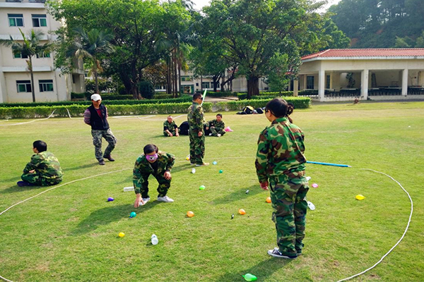 這個項目是模擬戰場,三人一組,分別扮演:司令(不能說話、面朝戰場)、參謀長(背對戰場)、士兵(蒙上眼罩,不能說話)。
